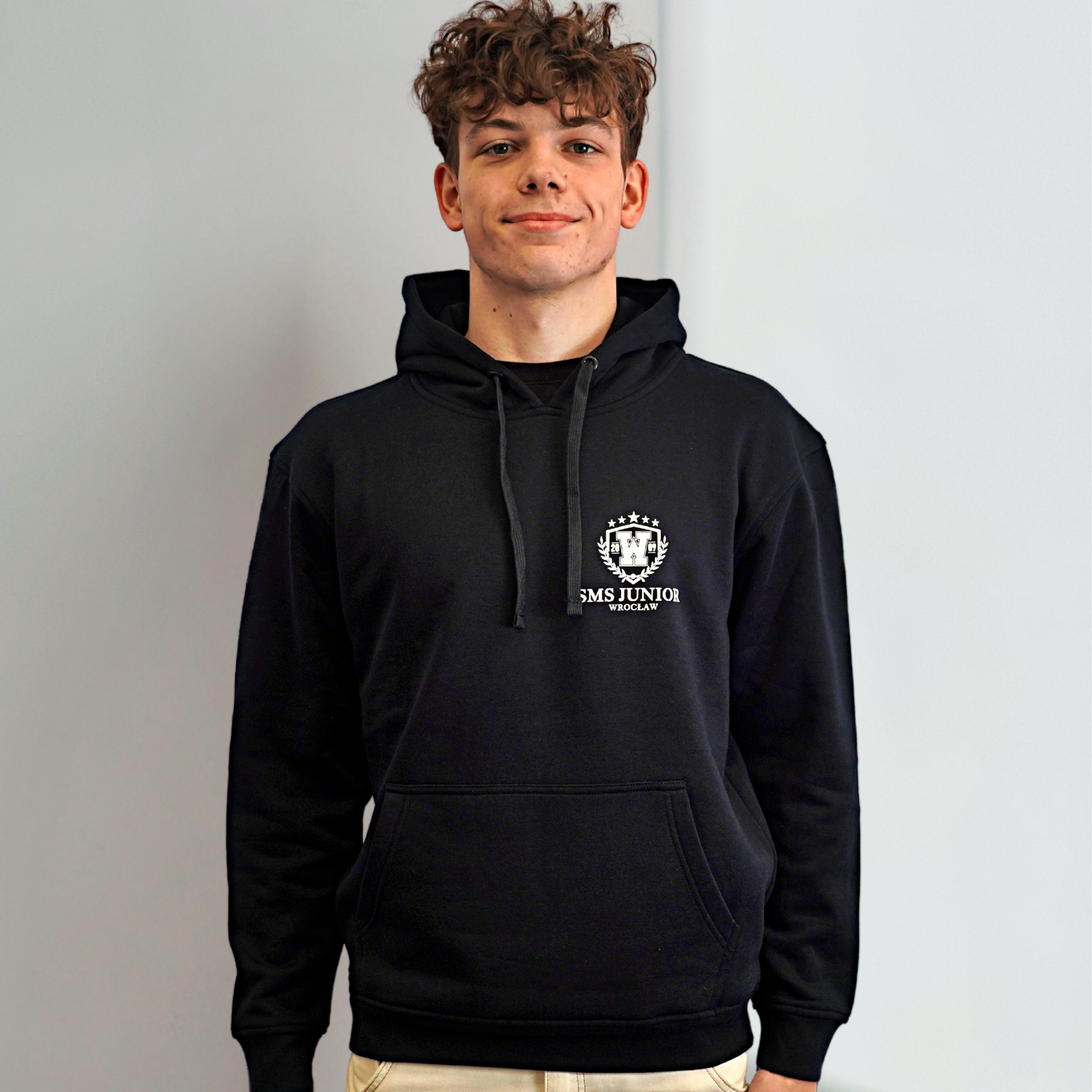 Bluza bawełniana z kapturem marki JHK 290g/m2 w kolorze Navy Blue z logo SMS JUNIOR WROCŁAW z przodu na klatce piersiowej. Brak sublimacji na plecach. Dedykowana jest zarówno dla uczniów, jak i rodziców. Przyjazny oraz lekki materiał, który jest delikatny dla skóry, zapewnia komfort podczas użytkowania. Głęboki kaptur oraz kieszonka z przodu pełnią nie tylko funkcje wizualne, ale również praktyczne. Ściągacze zostały wzmocnione lycrą, dzięki czemu zapewniona została stabilizacja, a także swoboda.