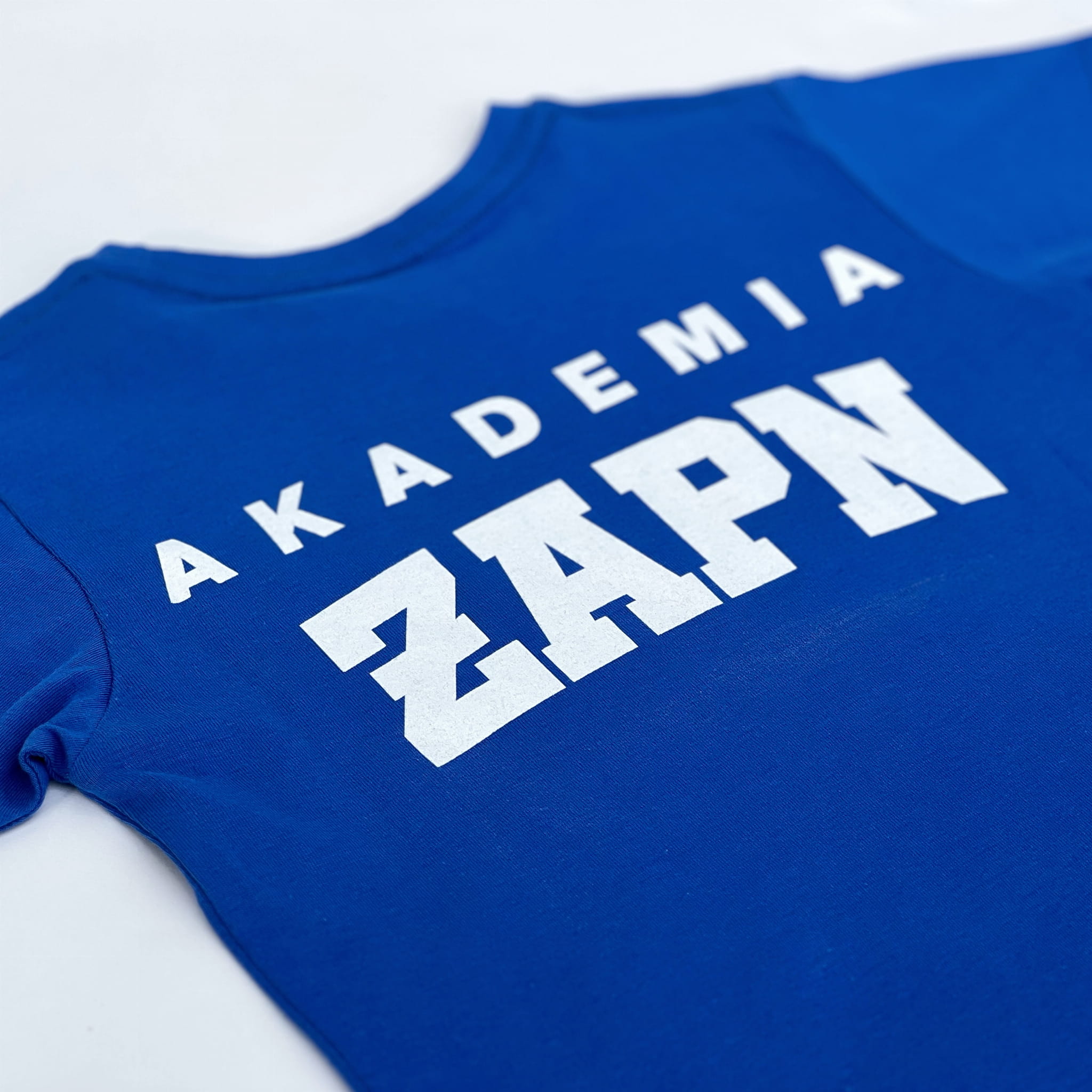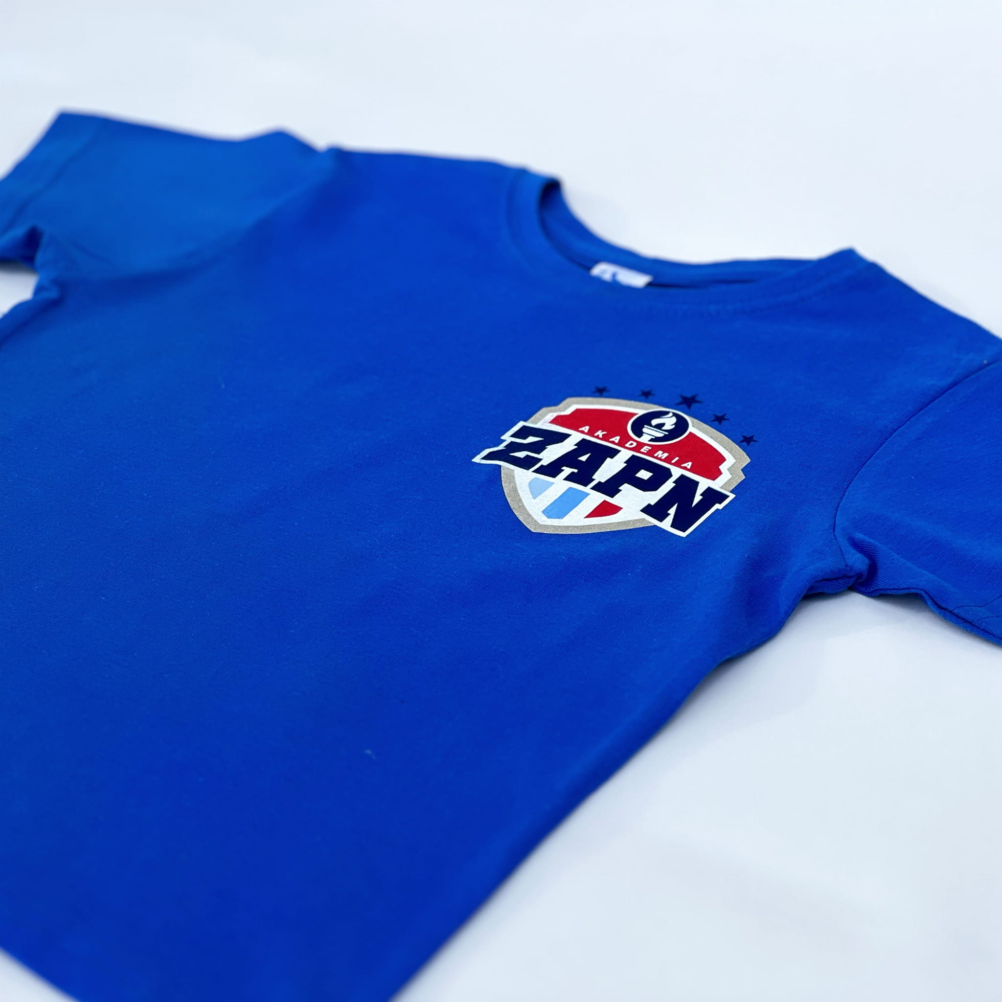 Koszulka bawełniana marki JHK w kolorze Royal Blue z logiem oraz napisem Akademii ŻAPN kids. Dedykowana jest dla dziewczynek z sekcji siatkówki. Przyjazny oraz lekki materiał, który jest delikatny dla skóry, zapewnia komfort podczas treningu. Krótki rękaw, brak bocznych szwów, a zarazem podwójne szwy na ramionach. Zastosowana została taśma wzmacniająca oraz wzmocniony lycrą ściągacz.